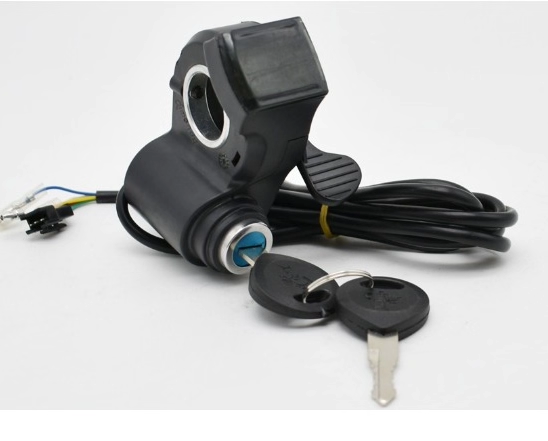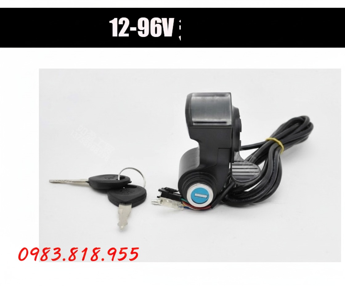 Ga xe điện dạng nhấn nút ngón tay cái, có ổ khóa và đồng hồ báo vôn, dùng được cho điện áp 12V–96V, lắp được nhiều loại xe điện khác nhau.